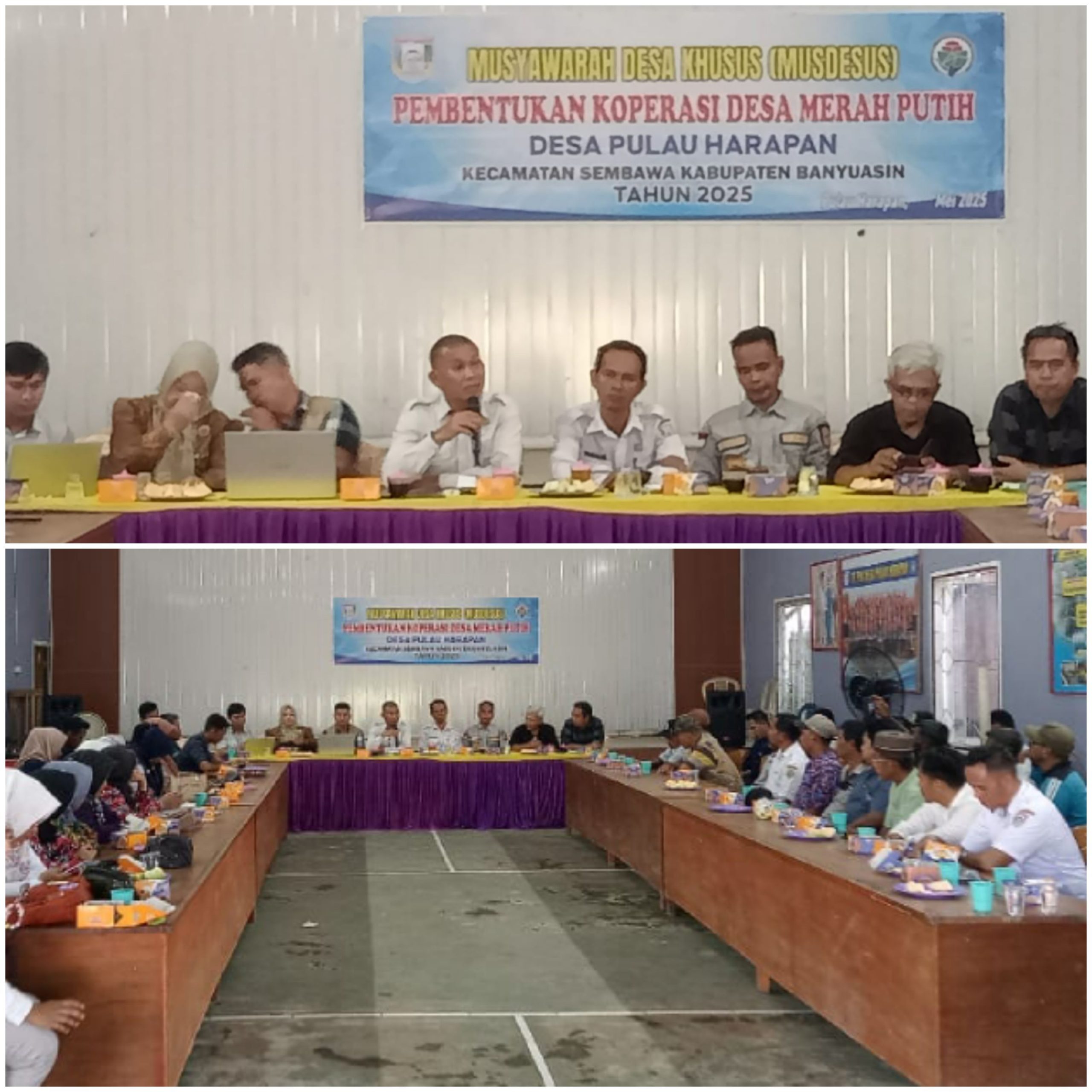 Merdeka45 News| Banyuasin Sumsel – Desa Pulau Harapan kecamatan sembawa kabupaten Banyuasin provinsi sumatera selatan laksanakan Musyawarah Desa khusus pembentukan koperasi Desa Merah Putih yang dilaksanakan di Gedung Serbaguna Desa Pulau Harapan pada 7 Mei 2025.