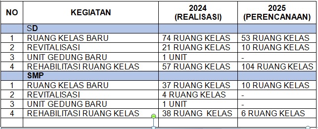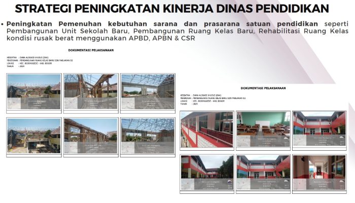 Dalam pemenuhan dan pengembangan sarana dan prasarana fisik penunjang mutu kualitas pembelajaran, Dinas Pendidikan Kabupaten Bogor telah melakukan serangkaian pembangunan dan penanganan kondisi fisik bangunan pada satuan pendidikan yang tersebar di 40 Kecamatan se-Kabupaten Bogor dengan data sebagai berikut :