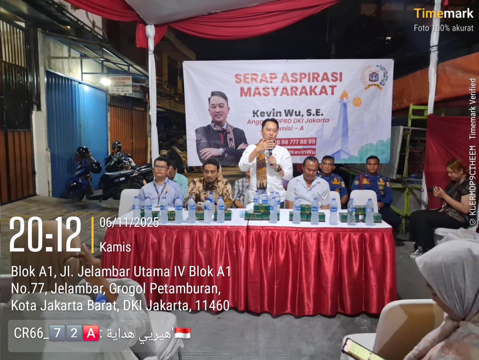 Merdeka45 News| Jakarta – Anggota DPRD DKI Jakarta dari Fraksi PSI, Kevin Wu, SE, menggelar kegiatan serap aspirasi masyarakat di Jalan Jelambar Utama IV, RW 008, Grogol Petamburan, Jakarta Barat, pada Kamis (6/11/2025). Kegiatan ini bertujuan memperkuat koordinasi pemerintah dan masyarakat dalam penanganan masalah infrastruktur, pencegahan kebakaran, drainase, hingga layanan publik.