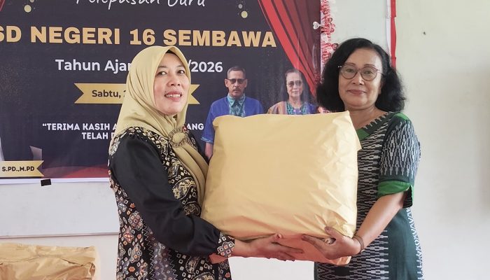 Pada kesempatan tersebut Kepala Sekolah SDN 16 Sembawa Nevin Susanti S. Pd, M. Pd, bekenan menyerahkan cendera mata kepada Guru yang memasuki Purnabakti, tak lupa beliau juga mengucapkan banyak terima kasih kepada kepala Desa Santan Sari, wali murid, komite sekolah, para staf pengajar, atas dukungan dan bantuan hingga pelaksanaan perpisahan berjalan dengan baik dan sukses.