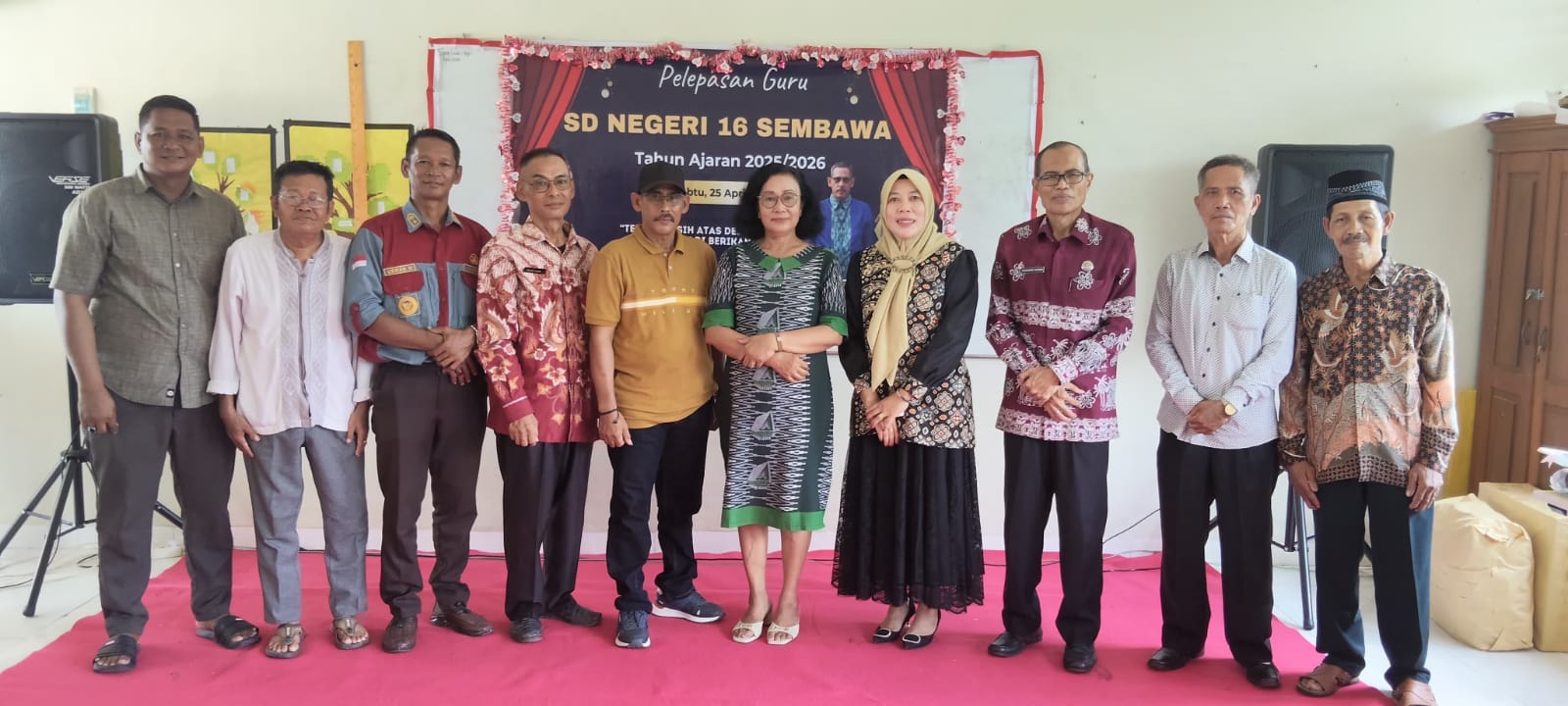 Dalam kata sambutannya Kepala Sekolah Sekolah SDN 16 Sembawa Nevin Susanti S. Pd, M. Pd menyampaikan Ucapan terimakasih yang sebesar-besarnya kepada Guru yang memasuki masa Purnabakti bapak Kowi S. Pd dan Ibu Marta Nursia Aritonang S. Pd, atas semua dharma bakti dan jasa – jasa mereka selama mereka mengabdi di SDN 16 Sembawa, yang mempunyai peran penting dalam mendidik siswa – siswi khususnya siswa – siswi SDN 16 Sembawa, memajukan dunia pendidikan dan mencerdaskan kehidupan bangsa, mereka sangat berjasa dalam mencerdaskan kehidupan bangsa.